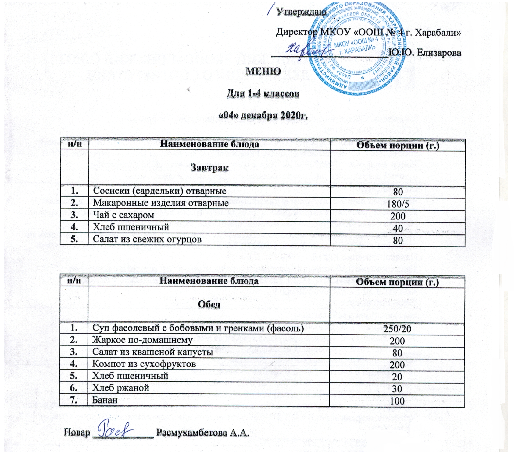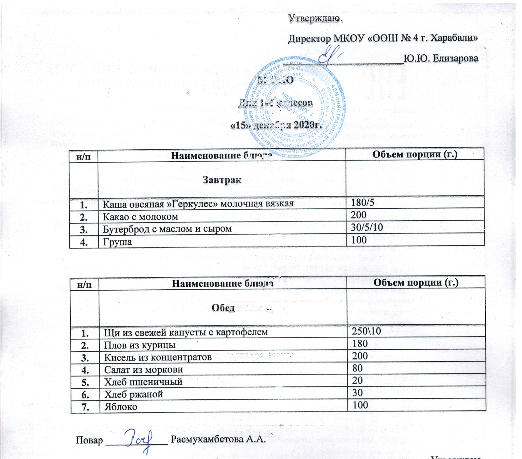 Меню бесплатного горячего питания для учащихся 1 - 4 класса (2020 - 2021 учебный год)