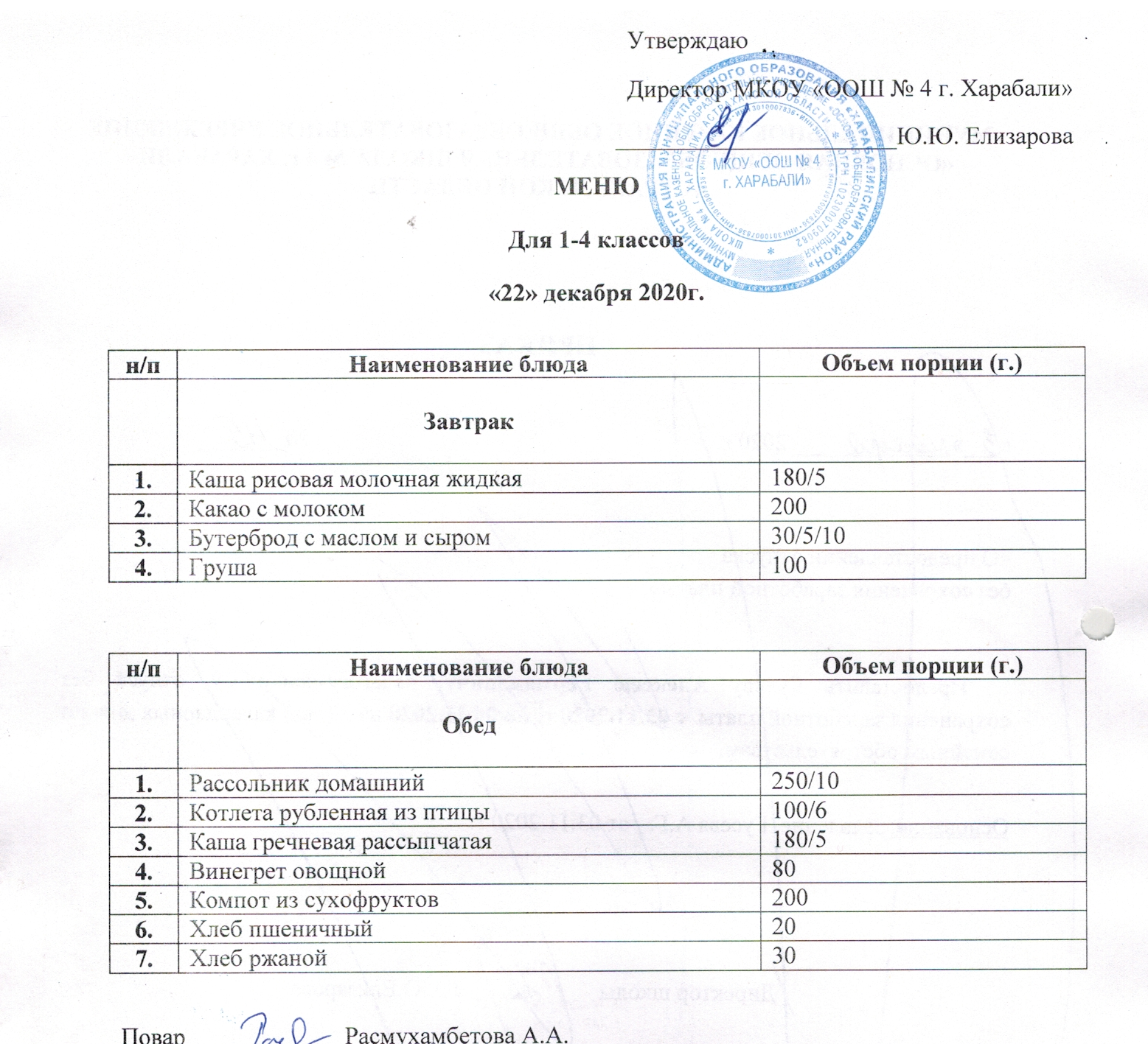 Меню бесплатного горячего питания для учащихся 1 - 4 классов